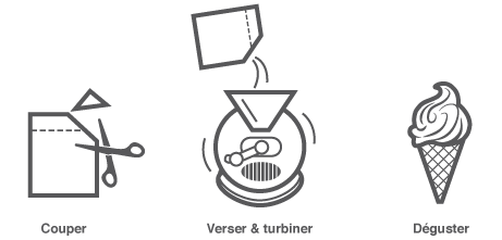 Une poche de mix, un coup de ciseaux, versez le mix dans la turbine et en moins de 10 minutes vous pourrez savourer, déguster et apprécier l’apogée d’une glace fraichement fabriquée.